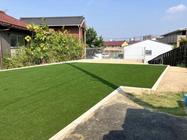 人工芝スペースをゆったりとり、かつコストを最小限とするため人工芝の割付を工夫しました。